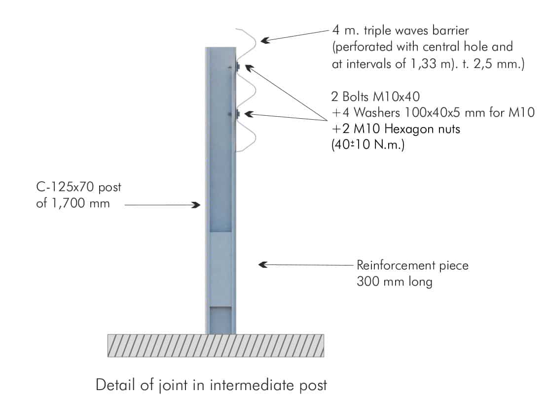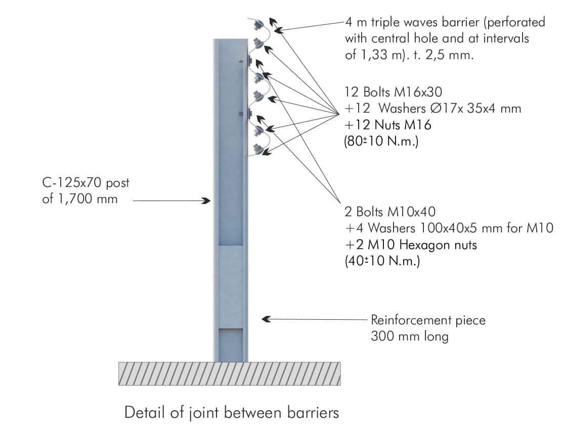 Single metal barrier for lateral side. System formed by a triple wave barrier, spacer and C posts with reinforcement piece 2 metres apart.
