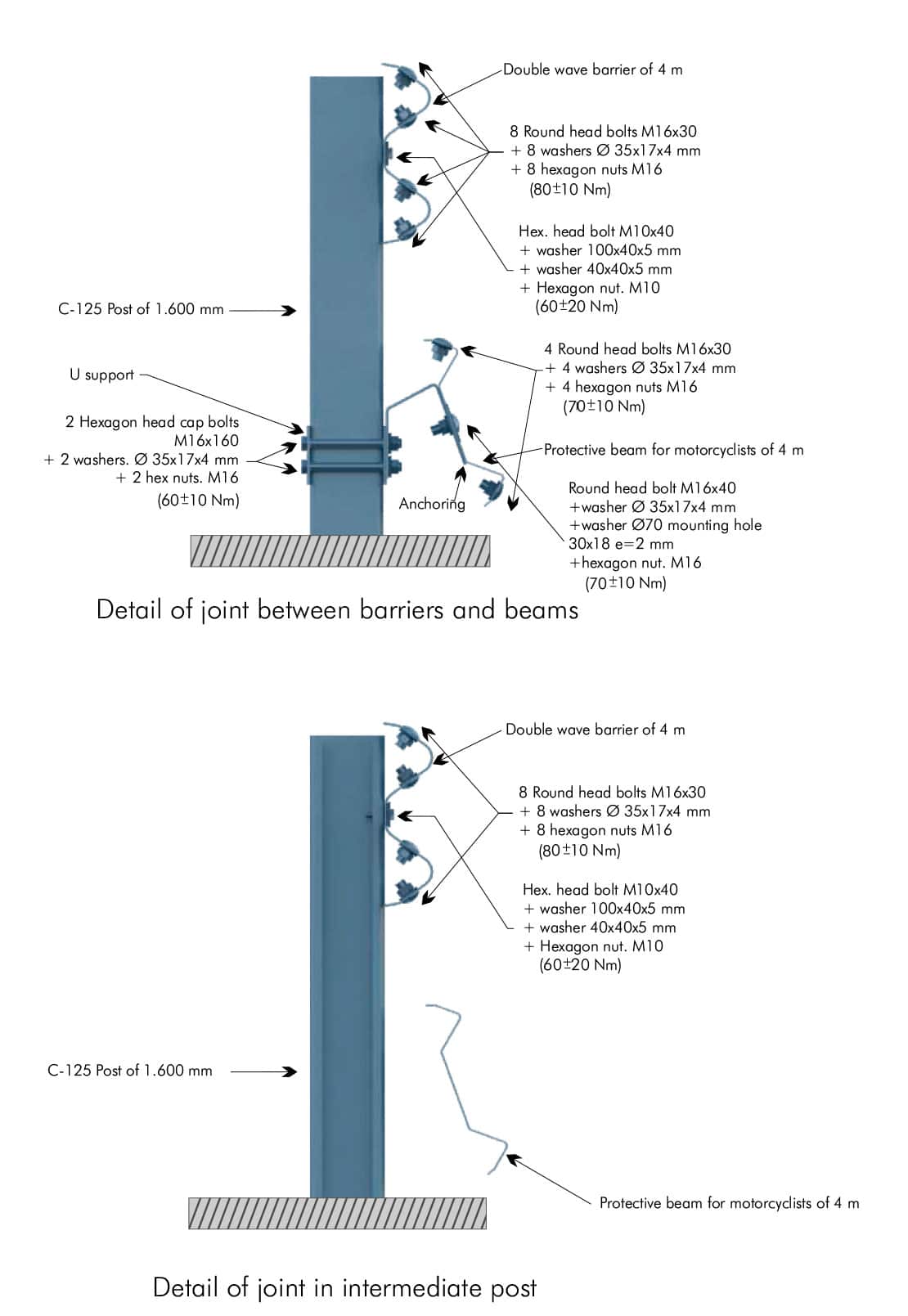 Single metal barrier for lateral side, with motorcyclist protection system. System formed by a double wave barrier, protective beam for motorcyclists and C posts 2 metres apart.