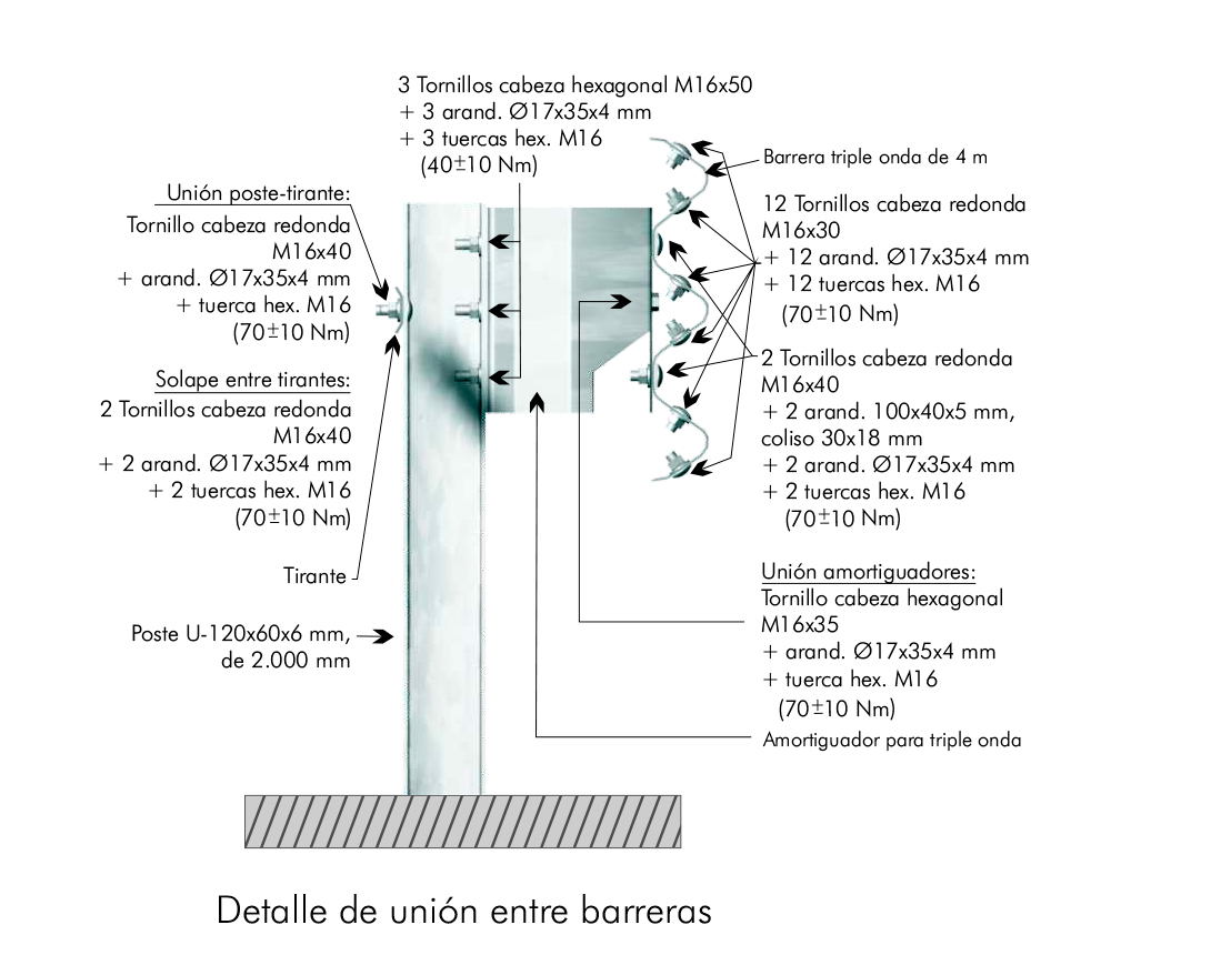 Barrera metálica simple para borde lateral. Sistema compuesto por una barrera triple onda, separador, tirante y postes U distanciados 2 metros entre sí.