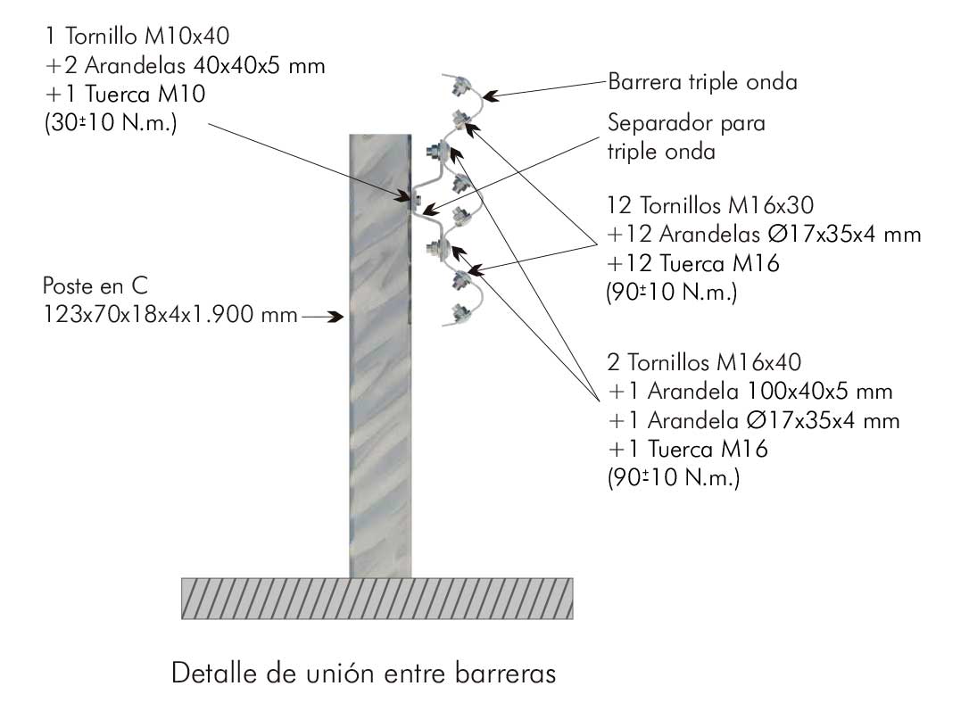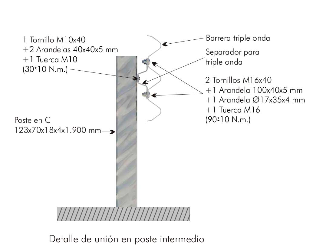 Barrera metálica simple para borde lateral. Sistema compuesto por una barrera de triple onda, separador y postes C distanciados 1,5 metros entre sí.