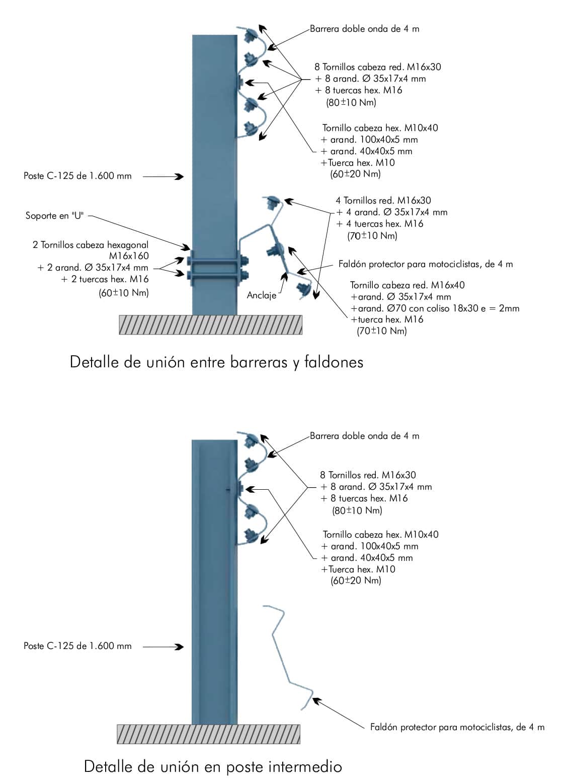 Barrera metálica simple para borde lateral, con sistema de protección para motociclistas. Sistema compuesto por una barrera de doble onda, faldón protector para motociclistas y postes C distanciados 2 metros entre sí.