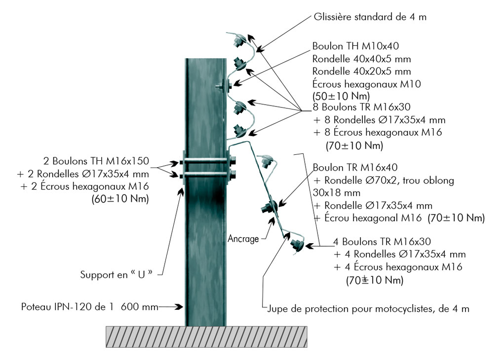 Glissière métallique simple pour accotement avec dispositif de protection pour motocyclistes. Dispositif composé d’une glissière à double ondulation, d’une jupe de protection pour motocyclistes et de poteaux « IPN » espacés de 4 mètres.