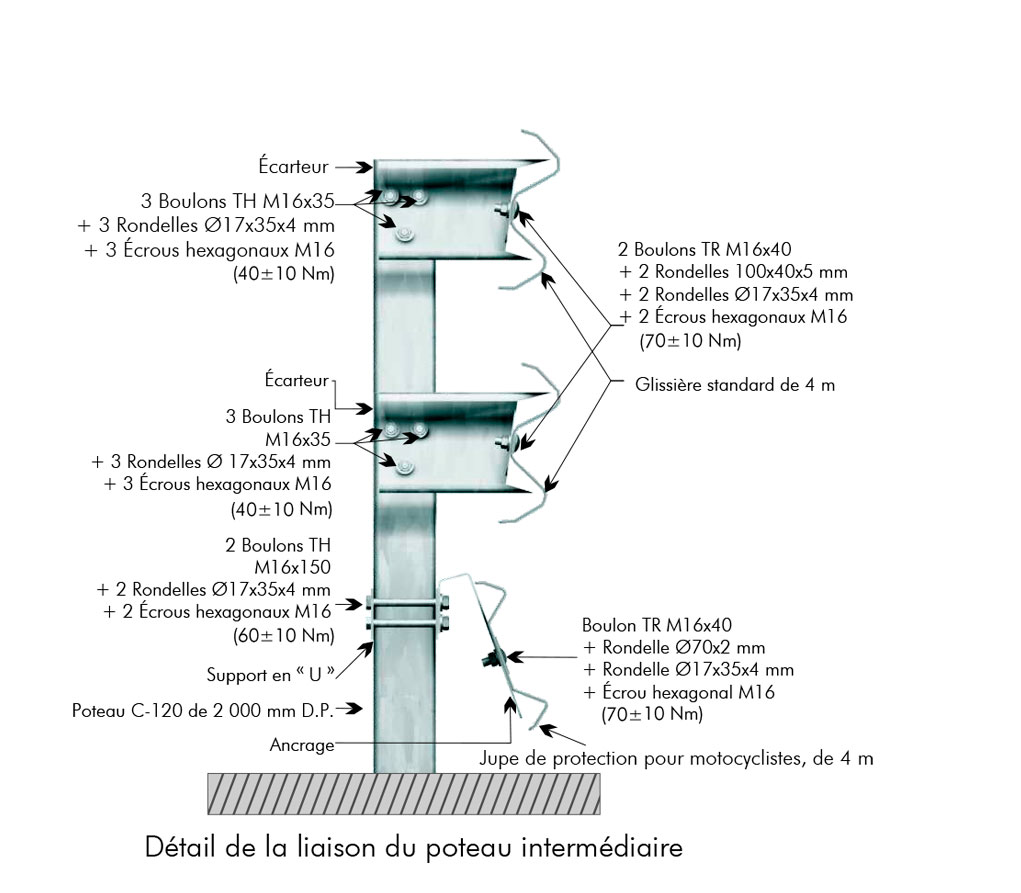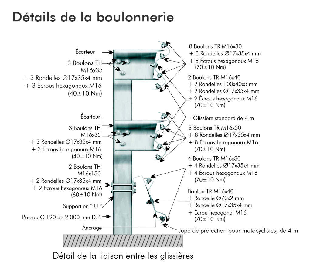 Glissière métallique double pour accotement avec dispositif de protection pour motocyclistes. Dispositif composé de deux glissières à double ondulation, écarteur, jupe de protection pour motocyclistes et poteaux en « C » espacés de 2 mètres.