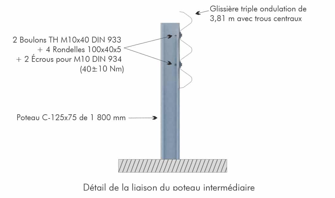 Glissière métallique simple pour accotement. Dispositif composé d’une glissière à triple ondulation et de poteaux en « C » espacés de 1,905 mètres.