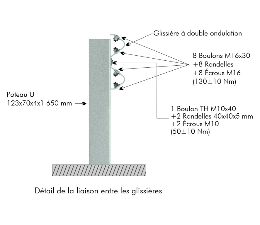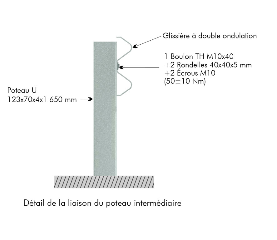 Glissière métallique simple pour accotement. Dispositif composé d’une glissière à double ondulation et de poteaux en « U » espacés de 2 mètres.