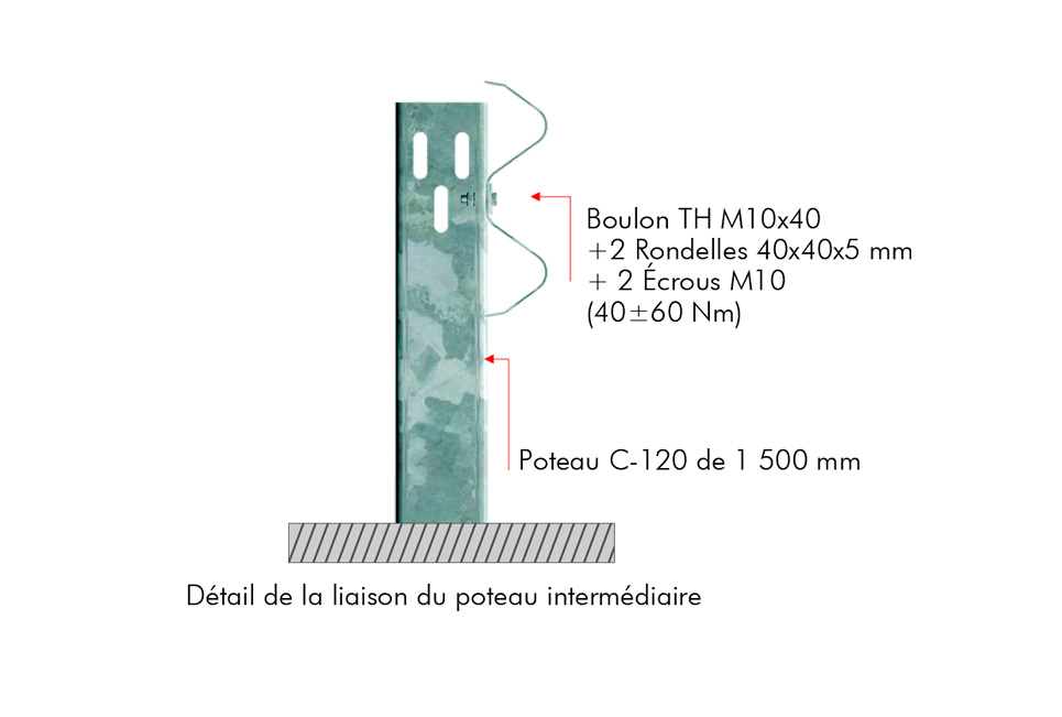 | Niveau de retenue | N2 | Largeur de fonctionnement (W) | W3 | Sévérité de choc | A | Déflexion dynamique (D) | 1,0 m |