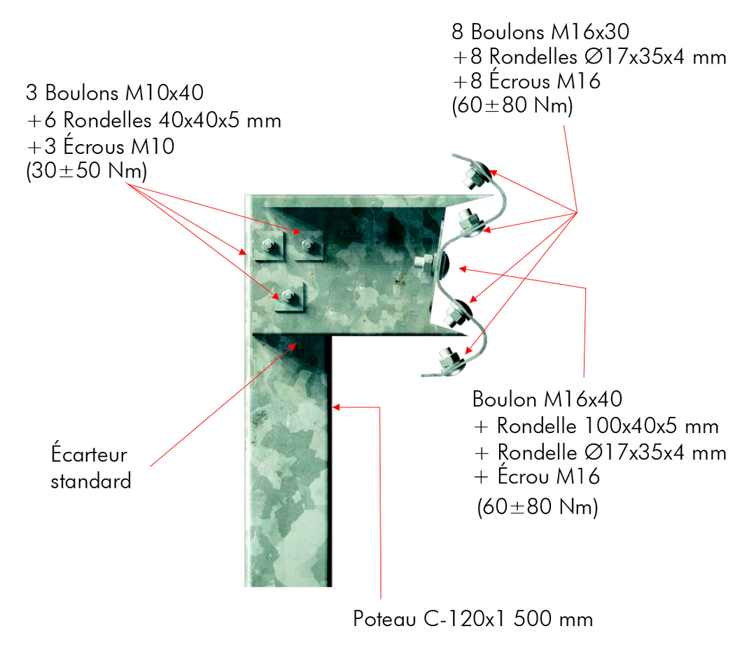 Glissière métallique simple pour accotement. Dispositif composé d’une glissière à double ondulation, écarteur et poteaux en « C » espacés de 4 mètres