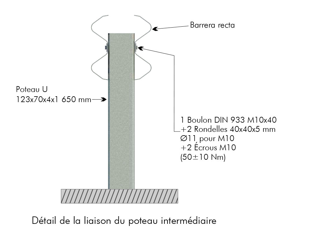 Glissière métallique symétrique réduite pour terre-plein. Dispositif composé de deux glissières à double ondulation et de poteaux en « U » espacés de 2 mètres.
